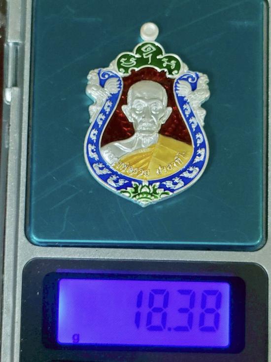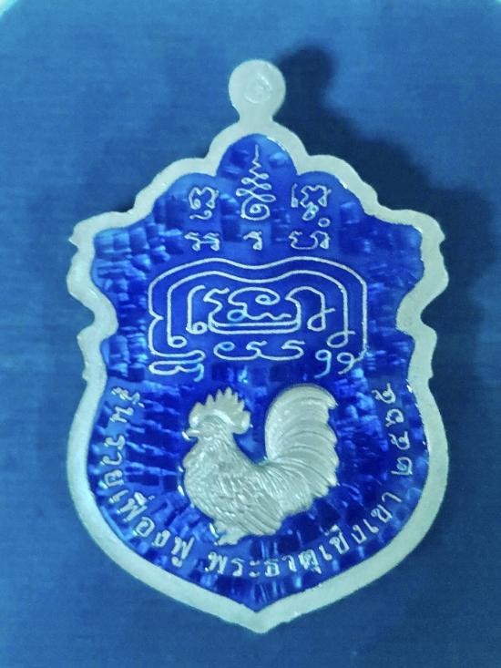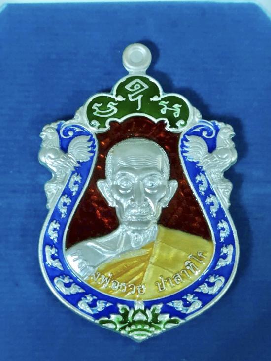 เหรียญหลวงพ่อรวย วัดตะโก จ.อยุธยา รุ่นรวยเฟืองฟู เนื้อเงินลงยา ตอกโค๊ต อุบนหูเหรียญด้านหลัง ตอกภาษาจีนใต้ยันต์ ตอกหมายเลข 66 ข้างยันต์มุมขวามือ