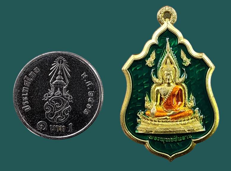 เหรียญโล่ห์พระพุทธชินราช หลังยันต์วิเศษอกเลาโภคทรัพย์ เนื้อทองทิพย์ลงยาสีเขียว เหนี่ยวทรัพย์ รุ่น สมโภชพระพุทธชินราช ครบ ๖๖๖ ปี