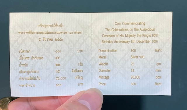 เหรียญกษาปณ์ที่ระลึก พระราชพิธีมหามงคลเฉลิมพระชนมพรรษา 80 พรรษา 5 ธันวาคม 2550 ชนิดราคา 800 บาท เนื้อเงิน 99 น้ำหนัก 22 กรัม สภาพ UNC