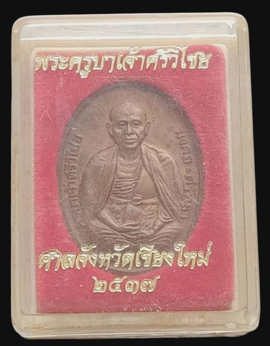 ชื่อพระเครื่อง เหรียญครูบาศรีวิชัยศาลสร้างจังหวัดเชียงใหม่ ปี 2537 เนื้อทองแดง สวยๆเลยครับ โค๊ตตาชั่ง มาพร้อมกล่องเดิมๆ