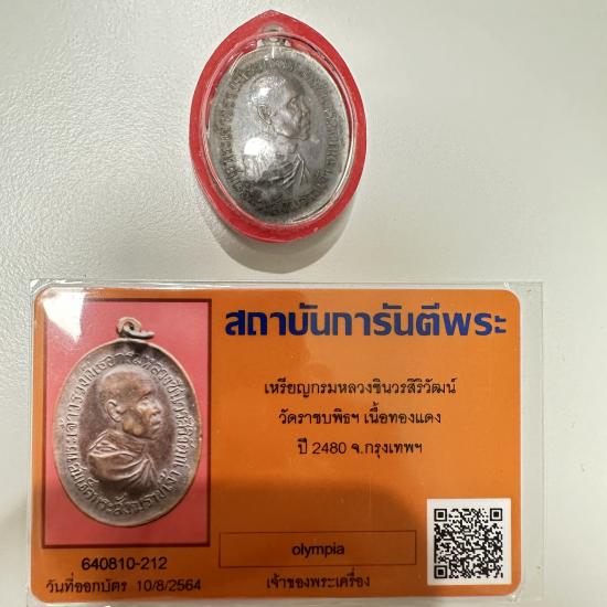 เหรียญกรมหลวงชินวรสิริวัฒน์ วัดราชบพิธฯ เนื้อทองแดง ปี 2480 จ.กรุงเทพฯมาพร้อมบัตรGครับ