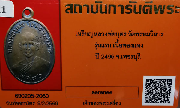 เหรียญหลวงพ่อบุตร วัดพรหมวิหาร รุ่นแรก เนื้อทองแดง ปี2496 จ.เพชรบุรี + บัตรG-pra สภาพเดิมค่ะ