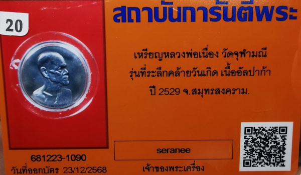 เหรียญหลวงพ่อเนื่อง วัดจุฬามณี ที่ระลึกคล้ายวันเกิด เนื้ออัลปาก้า ปี2529 จ.สมุทรสงคราม + บัตรG-pra สภาพสวยเดิมค่ะ