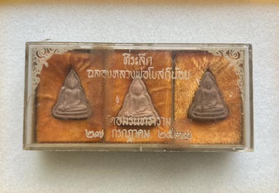 ชุดพระเนื้อดินหลวงพ่อโบสถ์น้อย วัดอมรินทราราม กรุงเทพ ปี 2523 จำนวน 3 องค์ พร้อมกล่องเดิมครับ แต่ขาพับกล่องชำรุดเจ้าของเดิมแป๊ะสก็อตเทปไว้นานแล้ว