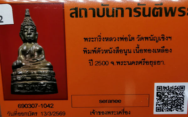 พระกริ่งหลวงพ่อโต วัดพนัญเชิง หนังสือนูน เนื้อทองเหลือง ปี2500 จ.พระนครศรีอยุธยา + บัตรG-pra สภาพเดิมค่ะ |