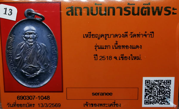เหรียญครูบาดวงดี วัดท่าจำปี รุ่นแรก เนื้อทองแดง ห่วงเดิม ปี2518 จ.เชียงใหม่ + บัตรG-pra สภาพสวยเดิมค่ะ |
