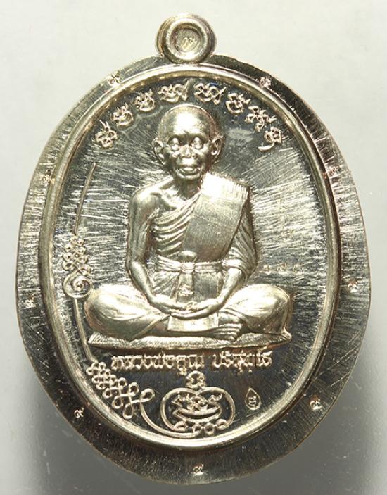 เหรียญหลวงพ่อคูณรุ่นมนต์พระกาฬวัดดำเนินสถิตย์(วัดบ้านกอก) เนื้อเงินไม่ตัดปีก ตอกโค๊ด 9 รอบ ปี57 หมายเลข 170 พร้อมกล่องเดิมครับ