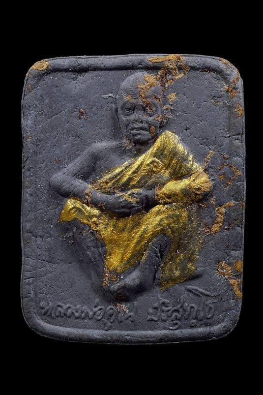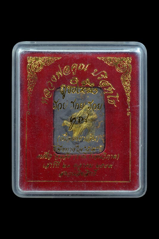 พระผงสี่เหลี่ยมรูปเหมือนนั่งชันเข่า ( 2.3 X 2.8 ซ.ม. ) รุ่น กูขอให้มึง รวย รวย รวย ( เนื้อผงผสมยาเส้นหลวงพ่อคูณ , พิเศษจีวรทาทอง ) พ.ศ.2549 ( กล่องเดิม ) ** 3 **
