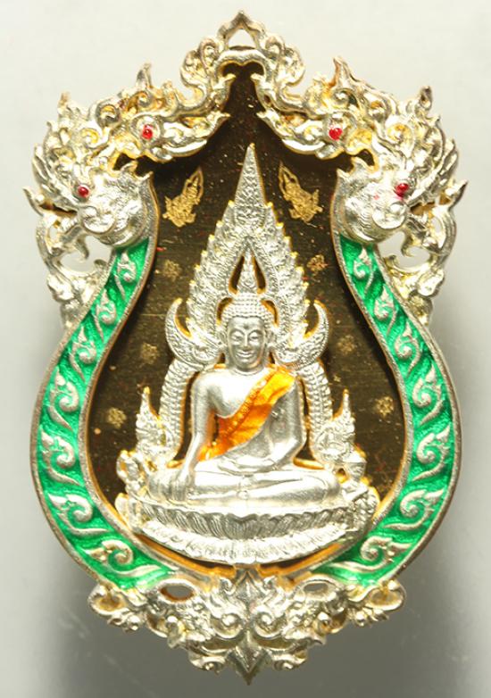 เหรียญหล่อฉลุพระพุทธชินราช รุ่น จอมราชันย์ วัดพระศรีรัตนมหาธาตุฯ จ.พิษณุโลก ปี 2555 เนื้อเงินลงยาราชาวดี ขอบสีเขียว หมายเลข 475 โค๊ด พุทธชยันตรี จาก ชุด พุทธชยันตรี สร้าง 99 องค์ พร้อมกล่องเดิม ครั