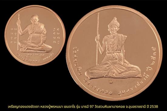 เหรียญทองแดงขัดเงา หลวงปู่พรหมมา เขมจาโร รุ่น บารมี 97 วัดสวนหินผานางคอย จ.อุบลราชธานี ปี 2538 เคาะเดียว