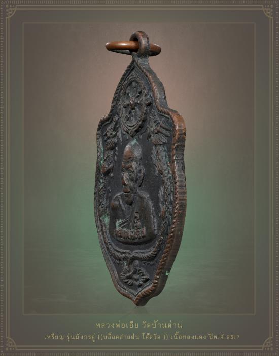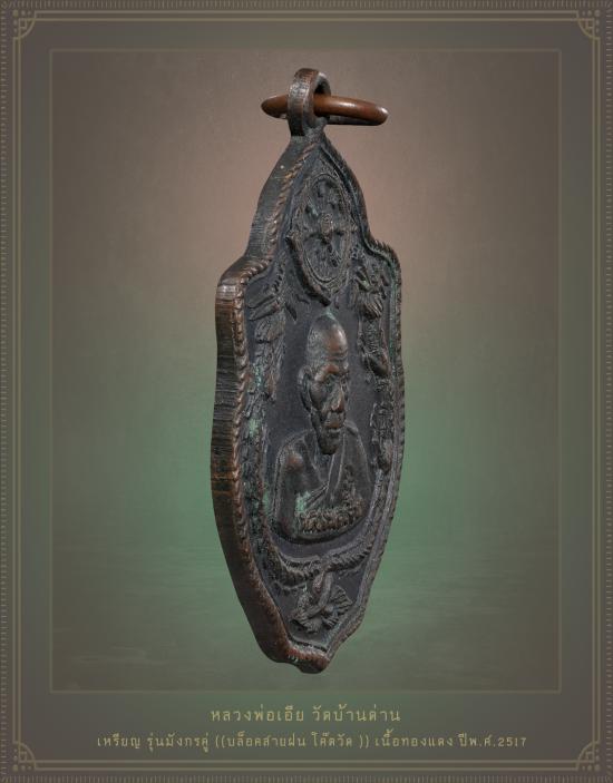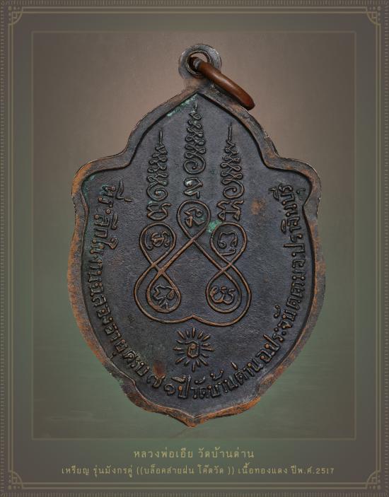 ชื่อพระเครื่อง เหรียญมังกรคู่ หลวงพ่อเอีย วัดบ้านด่าน จ.ปราจีนบุรี บล็อคสายฝน โค๊ตวัด เนื้อทองแดงรมดำ ปี17 **ด้านหลังมีจารมือ** ผิวเดิมๆ