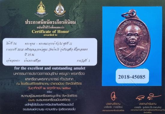 เหรียญหลวงพ่อคูณ วัดบ้านไร่ รุ่นรับเสด็จ บล็อก อ.แตก เนื้อทองแดงผิวไฟ ปี 2536 พร้อมใบประกาศ ติดรางวัลที่ 1 งานจังหวัดจังหวัดพิจิตร (งานสมาคมฯ) |