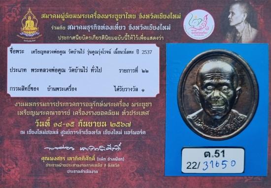 เหรียญรูปเหมือนหลวงพ่อคูณ รุ่นคูณรุ่งโรจน์ เนื้อนวะ ปี2537 ติดรางวัลที่ 1 งานประกวดจังหวัดเชียงใหม่ (งานสมาคมฯ) |