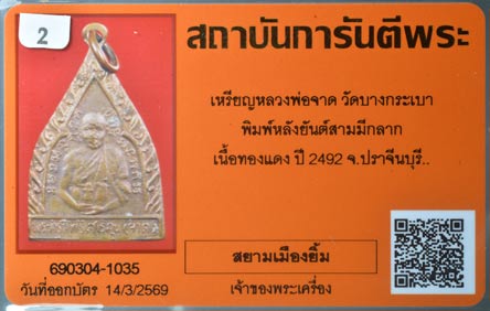 เหรียญหลวงพ่อจาด วัดบางกระเบา จ. ปราจีนบุรี ปี 2492 เคาะเดียว |