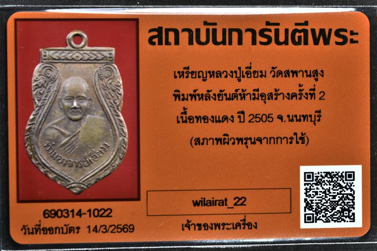 เหรียญหลวงปู่เอี่ยม วัดสพานสูง ปี05 หลังเรียบบล็อค2 พร้อมบัตรรับรอง