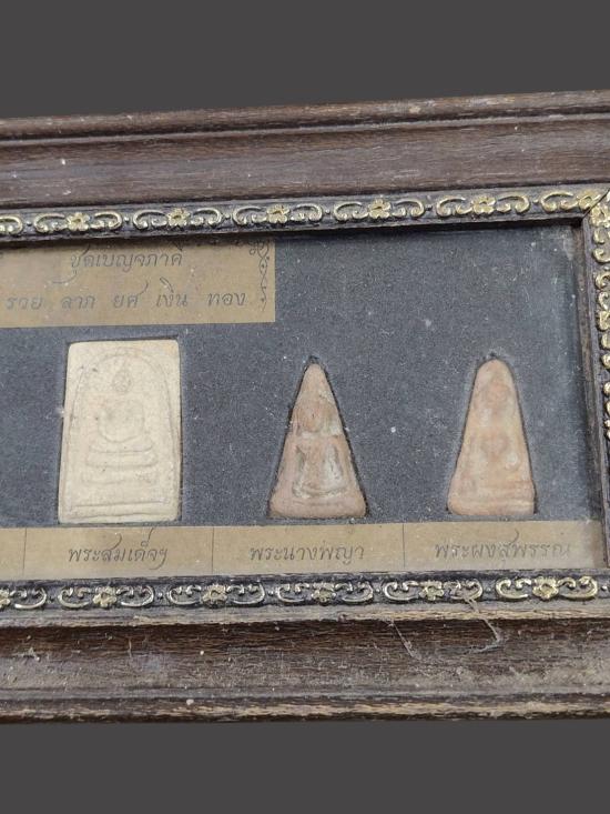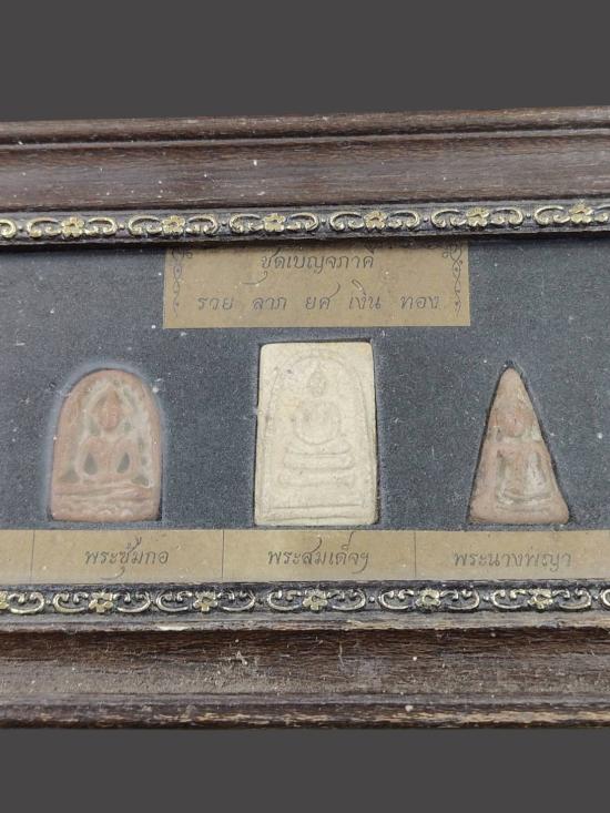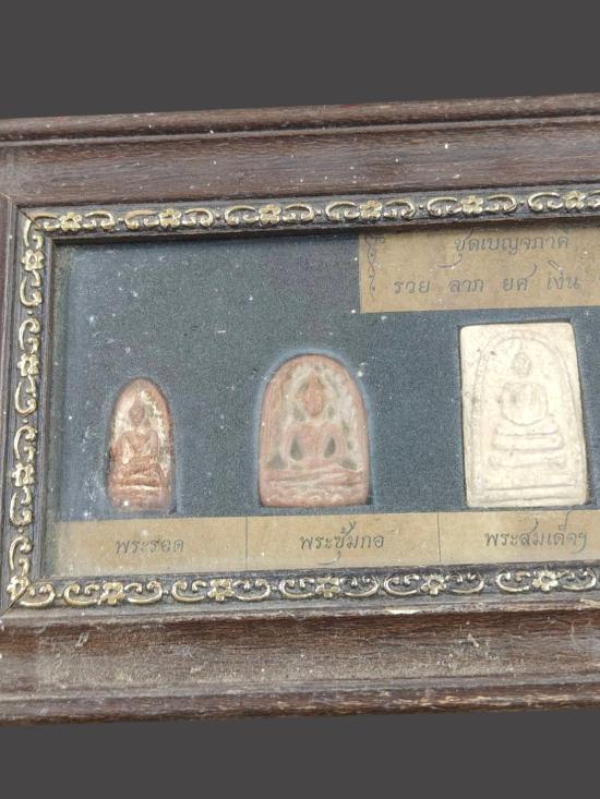 A8278.พระเนื้อดินผง ชุด 5 องค์ พระสมเด็จ พระซุ้มกอ พระรอด พระนางพญา พระผงสุพรรณ กรอบเก่าสำหรับตั้งบูชา ไม่ทราบที่ เคาะเดียวเเดง |