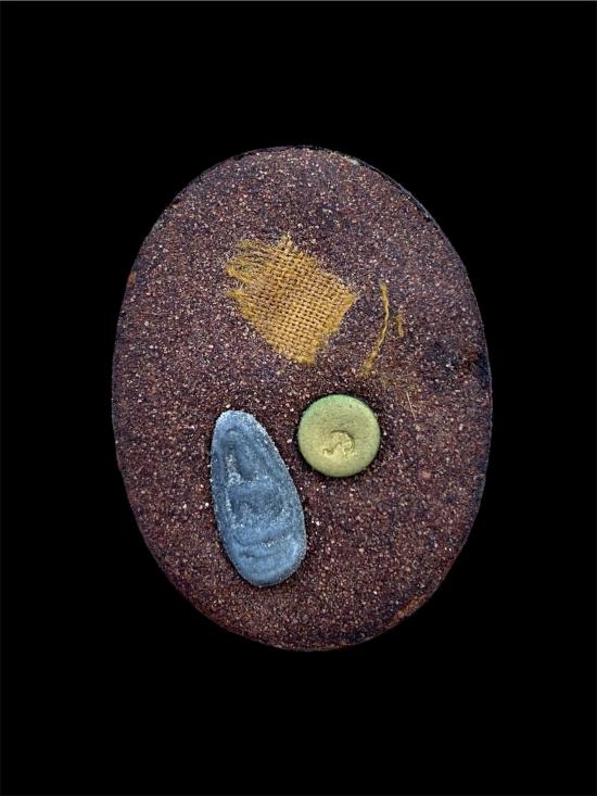 -ด้านหลัง ฝังเม็ดโค๊ด เกษาหลวงปู่ ผ้าจีวรผงวิเศษที่หลวงปู่ลบผงเอง ชานหมาก ข้าวก้นบาตร ผงนางตะเคียน และพระใบมะขาม องค์เล็กที่หลวงปู่เสกแล้ว 9 ครั้ง