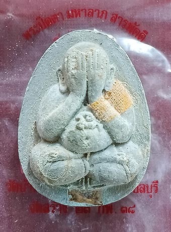 พระปิดตาวัดบ้านคลอง รุ่นสารพัดดี เนื้อผง(เทา) หลังฝังปรกใบมะขามและฝังตะกรุด ปี2538 พร้อมซองเดิมและกล่อง