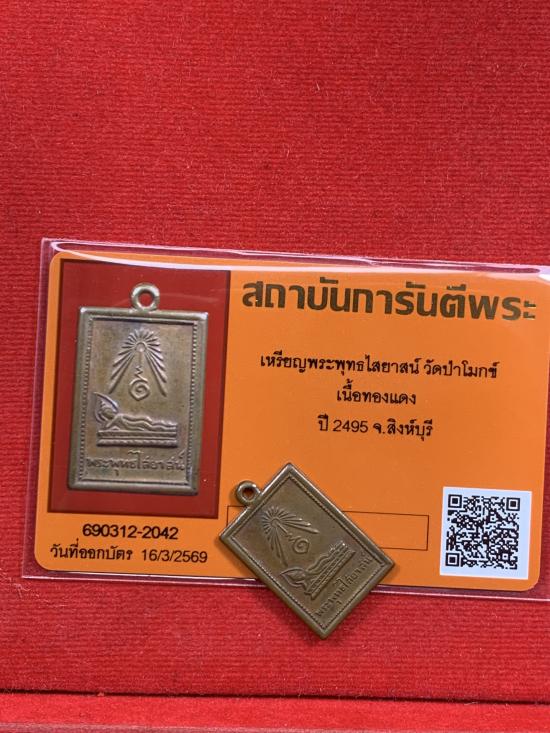 เหรียญพระพุทธไสยาสน์ วัดป่าโมกข์ ปี 2495 เนื้อทองแดง หายากครับ มาพร้อมบัตรรับรองครับ