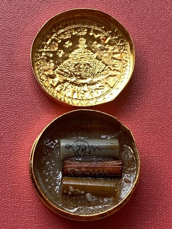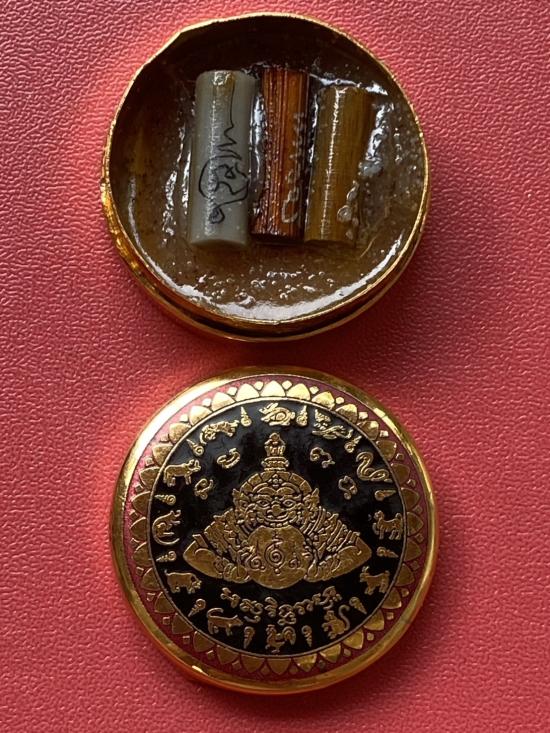 เคาะเดียวแดง สีผึ้งพระราหู รุ่น มงคลจักรวาล เนื้อ โลหะชุบทองลงยาสีดำขอบสีแดง ขนาด3.2ซม |