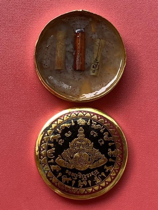 เคาะเดียวแดง สีผึ้งพระราหู รุ่น มงคลจักรวาล เนื้อ โลหะชุบทองลงยาสีดำขอบสีแดง ขนาด5ซม |