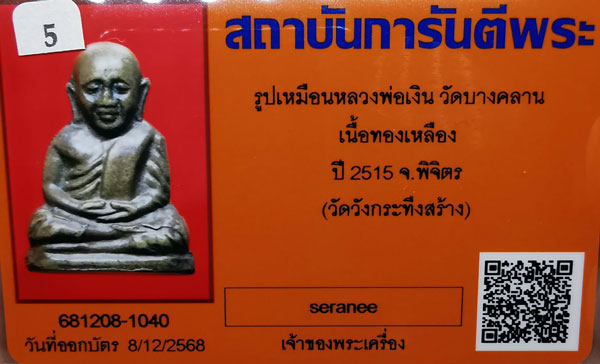 รูปเหมือนหลวงพ่อเงิน วัดบางคลาน เนื้อทองเหลือง ปี2515 จ.พิจิตร(วัดวังกระทึงสร้าง) + บัตรG-pra สภาพเดิมค่ะ