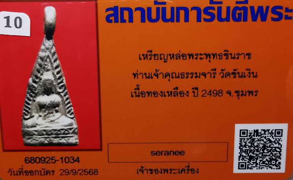 เหรียญหล่อพระพุทธชินราช ท่านเจ้าคุณธรรมจารีย์ วัดขันเงิน เนื้อทองเหลือง ปี2498 จ.ชุมพร + บัตรG-pra สภาพสวยเดิมค่ะ พระสภาพตามรูปทุกประการค่ะ