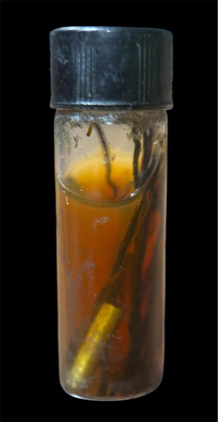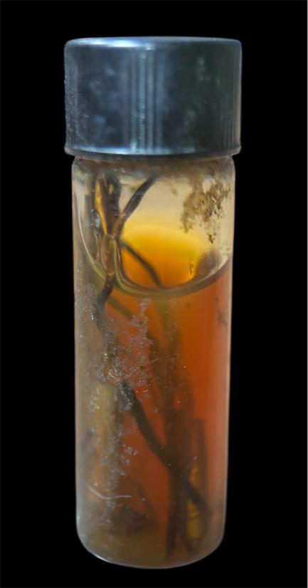 น้ำมันเก่า มีตะกรุดสองดอกและรากไม้ไม่ทราบที่
