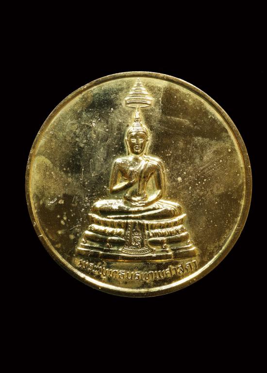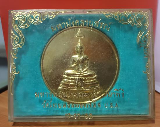 เหรียญพระพุทธนรเทพศาสดา มหามังคลานุสรณ์ มหาอุดมมงคลการพัทธสีมาพิธี วัดไทยลอสแองเจลีส USA. ((( เนื้อกะไหล่ทอง ขนาด 7.5 ซม. ))) หนา 5 มม. สวยผิวเดิม พร้อมกล่องเดิม หายาก