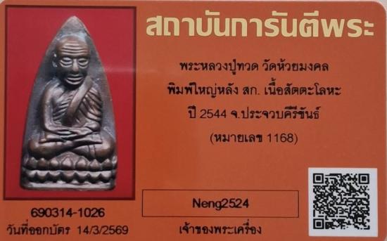 เลข 168 ฮกลกซิ่ว สวยแชมป์เปี้ยนโลกครับ หลวงปู่ทวด สก. วัดห้วยมงคล รุ่นแรก ปี 44 พิมพ์ใหญ่เตารีด เนื้อสัตตะโลหะขัดเงา หมายเลข 1168 + บัตร g pra ครับ