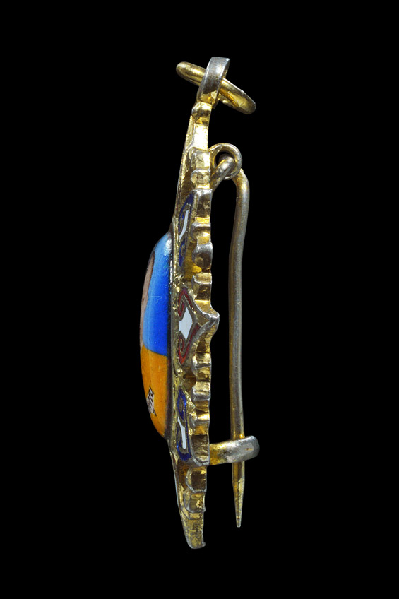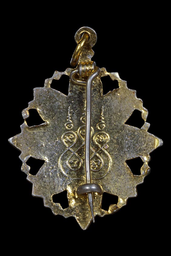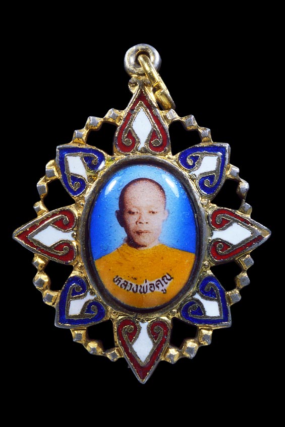 ล็อกเก็ตเข็มกลัดครึ่งองค์หน้าหนุ่ม ที่ระลึกในงานผูกพันธสีมา วัดเจริญพรต ( ตัวถังโลหะลายฉลุกะไหล่ทอง ลงยาธงชาติ ) พ.ศ.2531 ** 3 **
