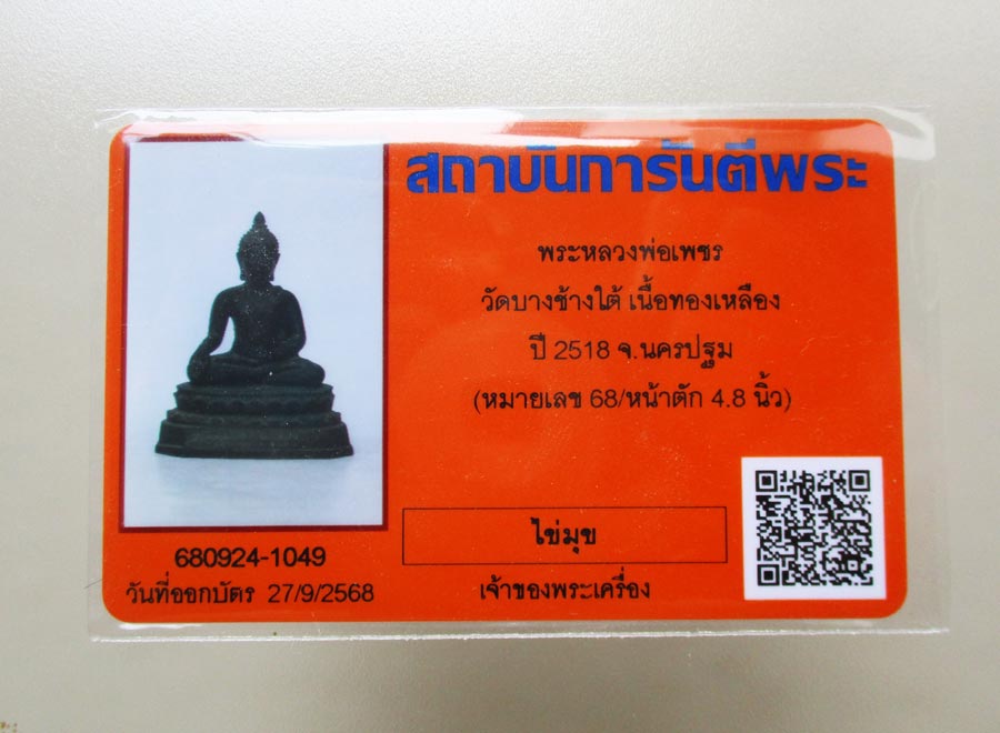 พระบูชาหลวงพ่อเพชร วัดบางช้างใต้ จ.นครปฐม พ.ศ.2518 หน้าตัก 5 นิ้ว เทดินไทยดำหยอดปูน เนื้อโลหะผิวแห้งหิ้ง พร้อมบัตรการันตีพระ !!
