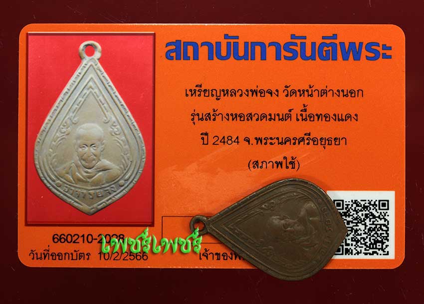 เหรียญ หลวงพ่อจง วัดหน้าต่างนอก รุ่นสร้างหอสวดมนต์ นิยม เนื้อทองแดง ปี2484 จ.พระนครศรีอยุธยา สภาพพอสวย ยังคมชัด พร้อมบัตรรับรองพระแท้จากการันตีพระสบายใจได้พระแท้แน่นอน ค่ะ