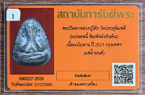 ปิดตาปลดหนี้หลังยันต์นะ(บล็อกแรก) ปี21 เนื้อใบลาน(แช่น้ำมนต์) หน้าขึ้นลายเสือขาวหลังดำ สวยมีเสน่ห์ พร้อมบัตรรับรองพระแท้