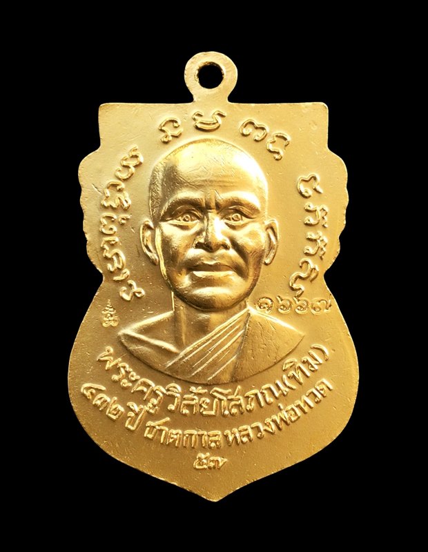หรียญเสมาหน้าเลื่อน หลวงปู่ทวด รุ่น 432ปี อาจารย์ทิม พิธีใหญ่ศาลหลักเมือง จ.ปัตตานี ปี2557 เนื้อกะไหล่ทอง ลงยาแดง บล็อค 2 จุด รัดประคตเต็ม สวยเดิมๆพร้อมกล่องครับ