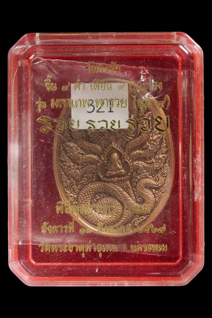 เหรียญมหาเทพ รุ่น มหาเทพ พารวย วัดพระธาตุท่าอุเทน พิมพ์ปิดตาปลดหนี้พญาศรีสัตตนาตราช หลังมหายันต์พลิกดวงเสริมชนะมาร หมายเลข 321 พร้อมกล่องเดิม