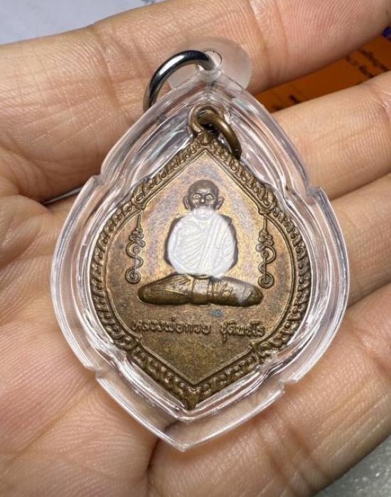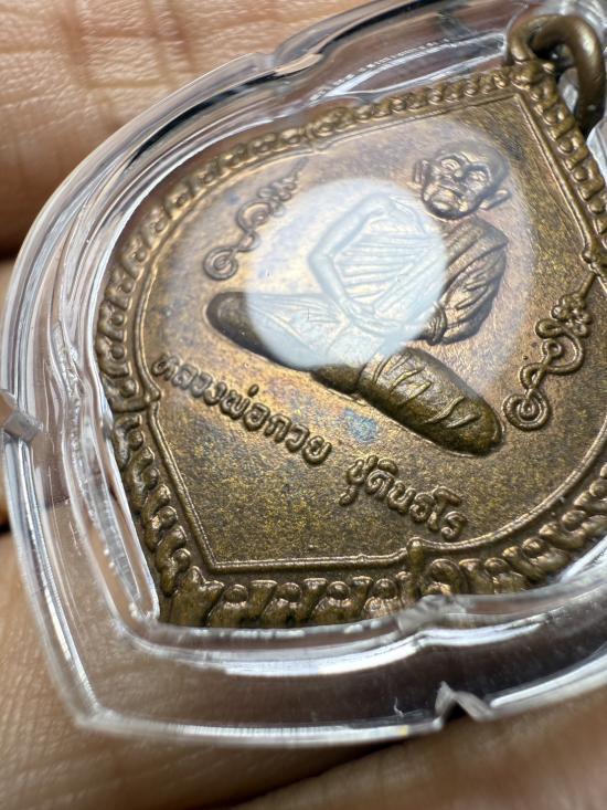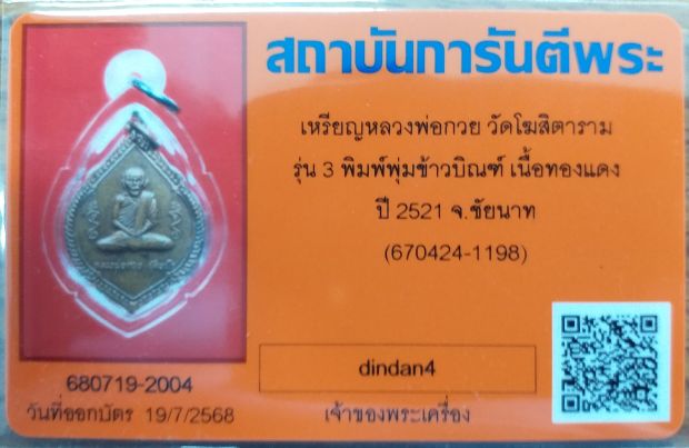 เหรียญหลวงพ่อกวย วัดโฆสิตาราม รุ่น3 พิมพ์พุ่มข้าวบิณฑ์ เนื้อทองแดง ปี 2521 จ.ชัยนาท มีห่วงเดิมๆและมีผิวไฟเดิมๆครับ เลี่ยมกรอบพลาสติก พร้อมบัตรรับรองครับ