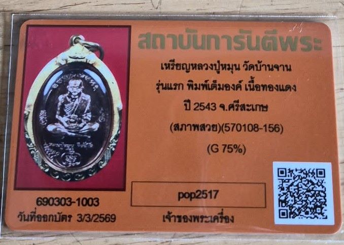เหรียญหลวงปู่หมุน วัดบ้านจาน รุ่นแรก พิมพ์เต็มองค์ เนื้อทองแดง ปี 2543 จ.ศรีสะเกษ