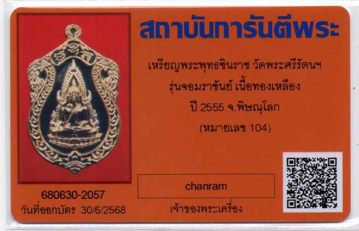 พระพุทธชินราช รุ่นจอมราชันย์ พิธีมหาจักรพรรดิ ณ.วัดพระศรีรัตนมหาธาตุ จ.พิษณุโลก ปี2555 เนื้อทองเหลือง หมายเลข.๑๐๔
