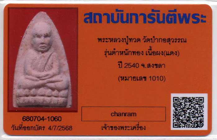 หลวงปู่ทวด รุ่นตำหนักทอง หลวงปู่ทอง สุสังวโร วัดป่ากอสุวรรณาราม อ.นาหม่อม จ.สงขลา ปี2540 เนื้อผงแดงหลังติดแผ่นเงินตอกโค้ดตอกเลข พร้อมบัตร สุดคุ้ม