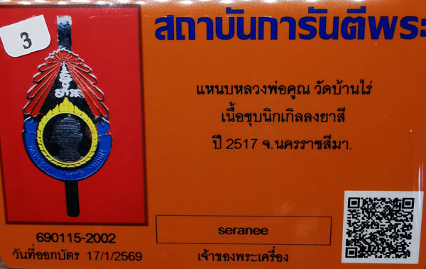 แหนบหลวงพ่อคูณ วัดบ้านไร่ เนื้อชุบนิกเกิลลงยาสี ปี2517 จ.นครราชสีมา + บัตรG-pra สภาพเดิมค่ะ