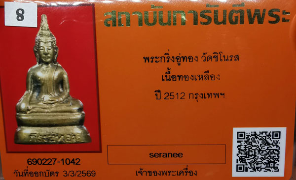 พระกริ่งอู่ทอง วัดชิโนรส เนื้อทองเหลือง กริ่งดัง ปี2512 จ.กรุงเทพฯ + บัตรG-pra สภาพเดิมค่ะ สภาพตามรูปทุกประการค่ะ