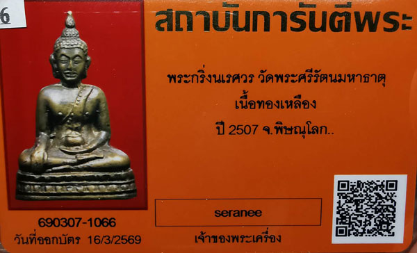 พระกริ่งนเรศวร วัดพระศรีรัตนฯ เนื้อทองเหลือง กริ่งดัง ปี2507 จ.พิษณุโลก + บัตรG-pra สภาพเดิมค่ะ |
