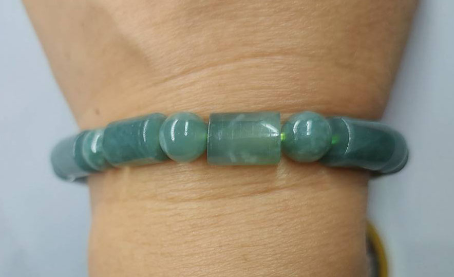 สร้อยข้อมือหยกพม่า สีโทนบลูสลับเขียว เม็ดกลมสลับทรงกระบอก ขนาด 7 มิลกับ สติกเกอร์ หลวงปู่เอี่ยม วัดหนังราชวรวิหาร