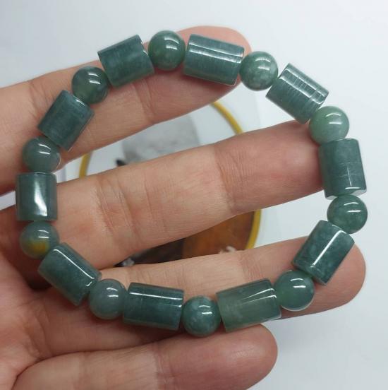 ***วัดใจ***สร้อยข้อมือหยกพม่า สีโทนบลูสลับเขียว เม็ดกลมสลับทรงกระบอก ขนาด 7 มิล กับ สติกเกอร์ หลวงปู่เอี่ยม วัดหนังราชวรวิหาร