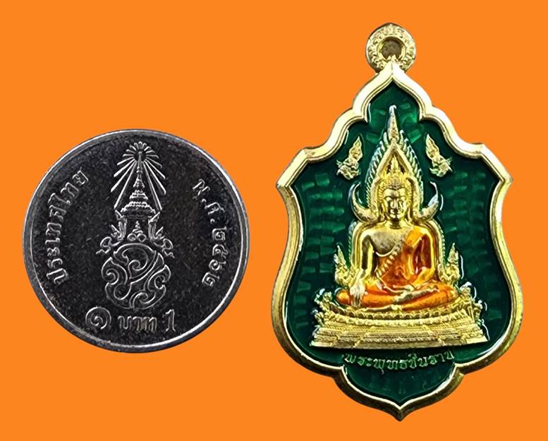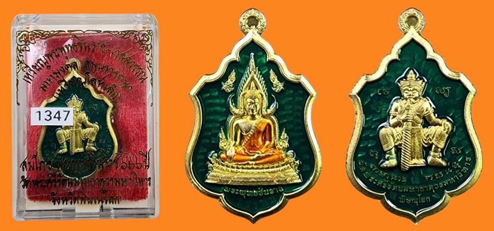 ( เลข 1347 ) เหรียญโล่ห์พระพุทธชินราช หลังยันต์วิเศษอกเลาโภคทรัพย์ เนื้อทองทิพย์ลงยาสีเขียว เหนี่ยวทรัพย์ รุ่น สมโภชพระพุทธชินราช ครบ ๖๖๖ ปี