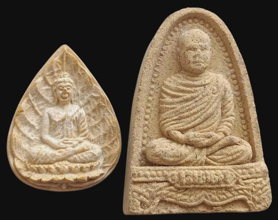 พระผงใบโพธิ์ พระอาจารย์เปลี่ยน ปัญญาปทีโป + พระผงพิมพ์เตารีด พระอาจารย์เปลี่ยน พิมพ์ใหญ่ เนื้อสีเหลือง โรยเส้นเกศาด้านหลัง ฝังข้าวสารดำ สภาพสวยเก็บเดิม ๆ
