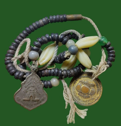 สร้อยกะลาตาเดียวพร้อมช้างแกะ พร้อมเหรียญพระเชียงแสน วัดพระธาตุเชิงชุม และ เหรียญหลวงพ่อพูล วัดไผ่ล้อม