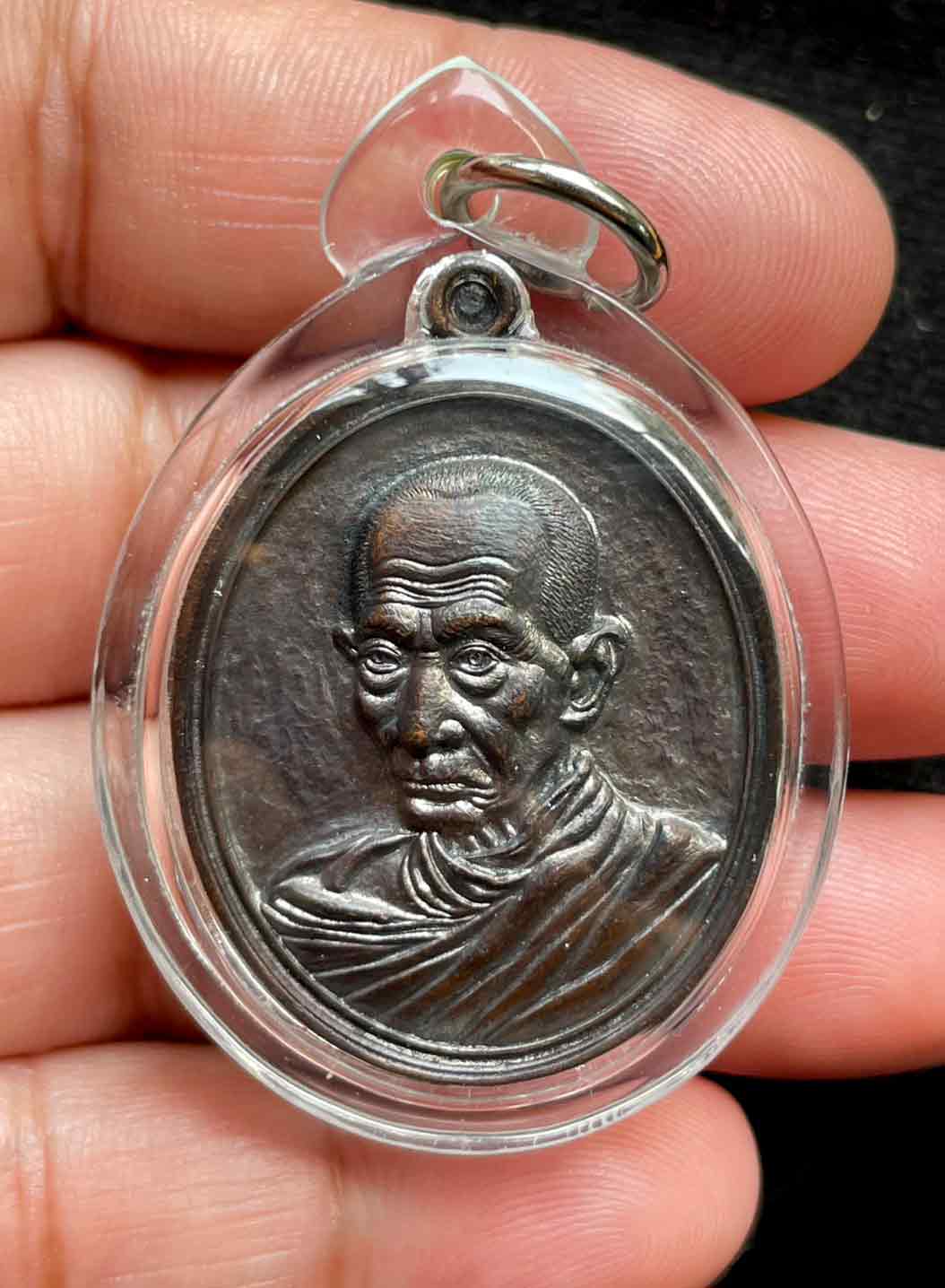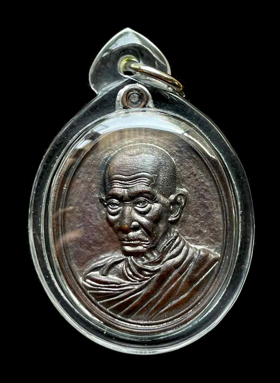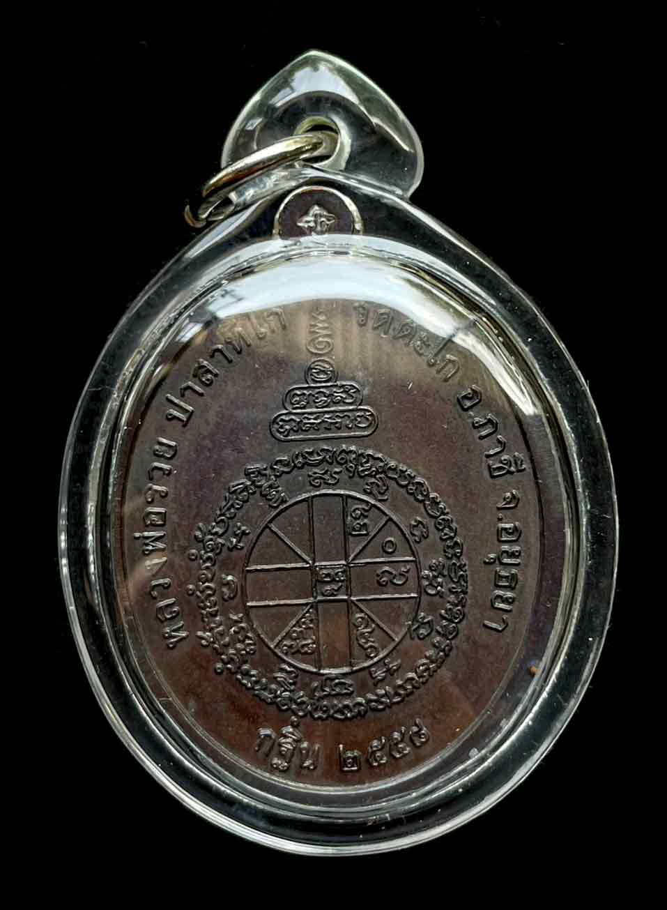 เนื้อทองแดงรมดำ ไม่เจาะหูเหรียญ ตอกโค๊ตที่หูเหรียญด้านหลัง เลี่ยมพลาสติก สวยงาม