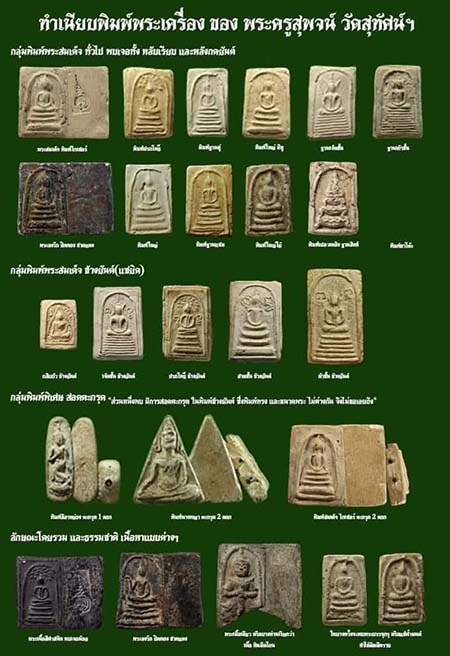 พระสมเด็จเนื้อผงผสมวัดระฆังหลังยันต์ หลวงพ่อสุพจน์ วัดสุทัศน์ฯ กรุงเทพมหานคร ปี ๒๔๘๔ ..สำหรับหลวงพ่อสุพจน์ วัดสุทัศน์ฯ ท่านเป็นพระลูกวัดของวัดสุทัศน์ในยุคพระสังฆราชแพ และพระครูลมูล อีกทั้งท่านยังสนิทสนมกันมากกับ หลวงปู่นาค วัดระฆัง ได้รับชิ้นส่วนแตกหักของสมเด็จวัดระฆังโดยตรงจากหลวงปู่นาคอีกด้วย ท่านเก็บสะสมพระแตกหักต่างๆ ที่คนเอามาทิ้งไว้ที่วัด นำมาบดละเอียดเป็นมวลสารในการสร้างพระขึ้นมาสืบต่อศาสนา โดยแจกให้กับลูกศิษย์ลูกหาของท่าน บางส่วนได้หลงเหลืออยู่ที่วัดสุทัศน์ (ในสมัยโน้น) หลวงพ่อสุพจน์ท่านเป็น พระเกจิที่สันโดษมาก ทำให้คนรู้จักจักกันน้อย หนังสือบางเล่มลงว่า พระผงของหลวงพ่อสุพจน์ เป็นเนื้อสมเด็จวัดระฆังล้วน **โปรดใช้วิจารณญาณ**..สมัยก่อนพระชำรุดแตกหัก คนจะนำไปถวายไว้ที่วัด หลักการเดียวกันกับวิธีการสร้างพระของพระครูลมูล สันนิษฐานว่าหลวงพ่อสุพจน์เองคงมีวิชาไม่น้อย เพราะได้อยู่ที่วัดสุทัศน์ ได้ร่วมพิธีการสร้างพระกริ่งต่างๆ มากมาย พระของท่านน่าจะได้เข้าร่วมในพิธีปลุกเสกพระกริ่งรุ่นต่างๆ ของทางสายวัด สุทัศน์ด้วย..พระสมเด็จชุดนี้ มีมากมายหลายพิมพ์ ทั้งเล็ก และใหญ่ ด้านหลังมีทั้งประทับยันต์พุทธซ้อน และหลังเรียบ แบบหลังกระดาน จัดสร้างโดย หลวงพ่อสุพจน์ นามเต็มของท่านคือ "พระครูพุทธมนต์วราจารย์" หรือสมณศักดิ์สุดท้ายก่อนที่จะละสังขารคือ "พระมงคลเทพโมลี" ท่านเป็นพระแบบว่าเก่งเงียบ ท่านมีวิชาลบผงสร้างผงจากตำราโบราณของวัดสุทัศน์ (ตำราโบราณของพระครูลมูล วัดสุทัศน์) เป็นสหายธรรมกับหลวงปู่นาค และหลวงปู่หิน วัดระฆัง จึงได้รับมอบผงสมเด็จวัดระฆังที่แตกหักเป็นจำนวนมาก ท่านเป็นหนึ่งในเกจิที่ร่วมปลุกเสกพระยี่สิบห้าพุทธศตวรรษ และงานพุทธาภิเษกใหญ่ๆ เช่น พิธีวัดประสาทฯ ปี ๒๕๐๖ พิธีปลุกเสกพระประจำจังหวัดชลบุรี ปี ๒๕๐๙ ที่วัดป่าชลบุรี ก็มีชื่อของท่านในทำเนียบพระเกจิอาจารย์ที่ได้รับการนิมนต์มาร่วมพิธีปลุกเสกด้วย สมเด็จพิมพ์นี้สร้างที่วัดสุทัศน์ฯ เมื่อปี ๒๔๘๔ (พิธีอินโดจีน) โดยลูกศิษย์ของท่านนำพระสมเด็จวัดระฆังที่แตกหักจำนวนมาก และไม่ได้ใครสนใจมาถวายท่าน ท่านจึงนำพระเหล่านั้นมาบดเป็นผงละเอียด และได้แกะพิมพ์ขึ้นมาใหม่ เช่น พระสมเด็จพิมพ์วัดระฆัง พระสมเด็จพิมพ์วัดบางขุนพรหม พระสมเด็จพิมพ์วัดเกษไชโย วัดเงินคลองเตย วัดพลับ วัดสามปลื้ม วัดโพธิ์ ขุนแผนบ้านกร่าง หลวงพ่อโตบางกระทิง พระลีลา เปิดโลก และพิมพ์ต่างอีกมาก ด้านหลัง มีทั้งปั๊มยันต์พุฒซ้อน และยันต์ตรี ที่หลังเรียบ